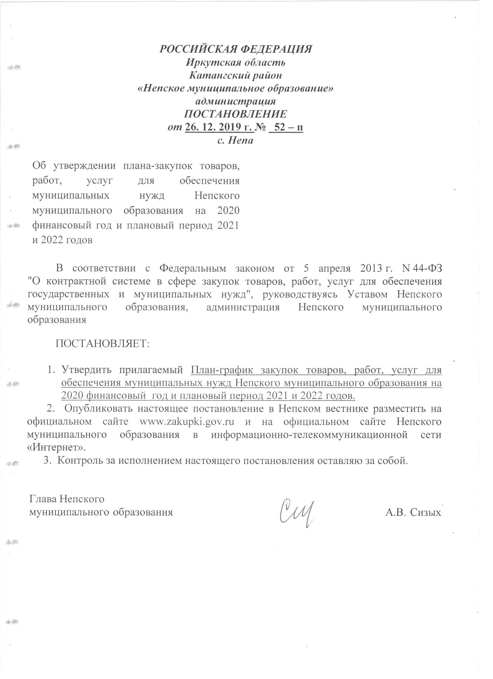 Постановление №52-п об утверждении плана-закупок товаров, работ, услуг